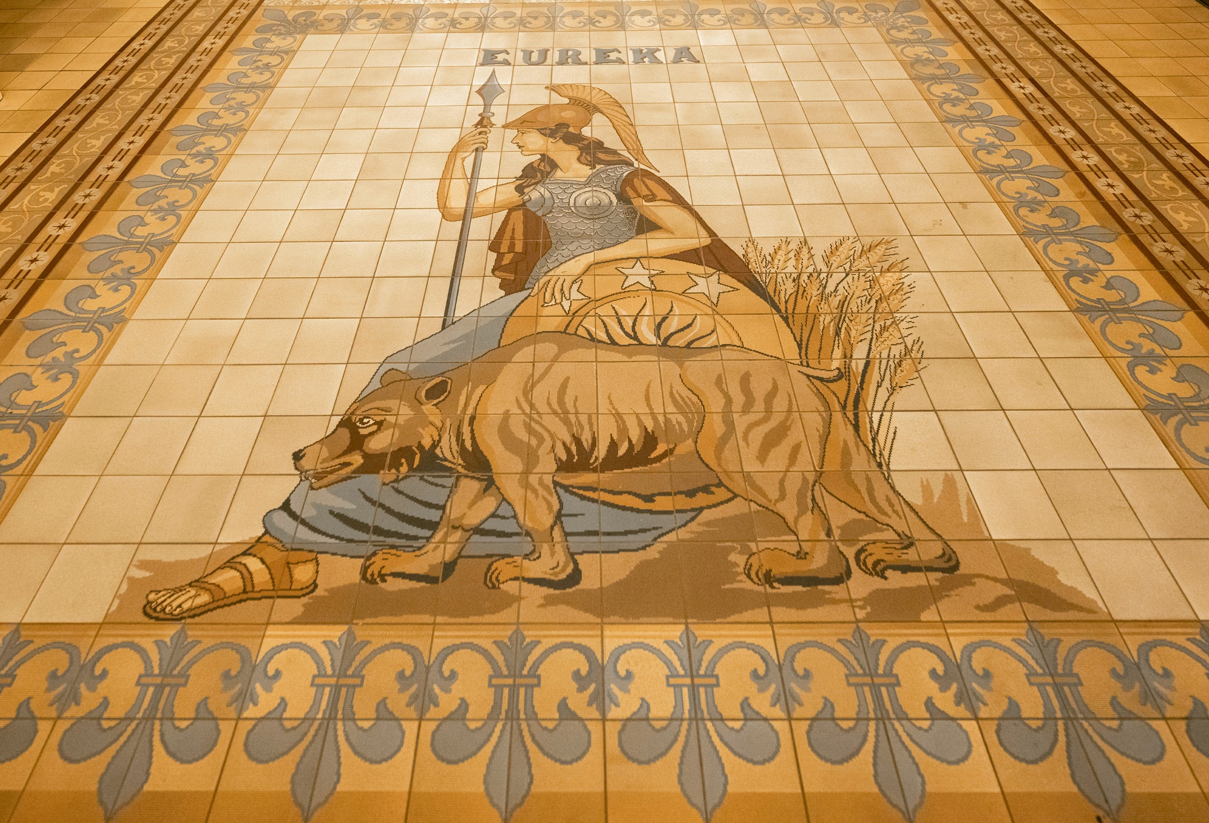 Four large tile groupings, featuring a seated Minerva beside a grizzly bear, are located in the north and south first-floor hallways of the Capitol building. Known as the “Eureka” mosaics, due to their inclusion of California’s state motto, these groupings were made using reproduction tiles during the 1970s restoration. Examples of the originals, installed in 1896, can be found in the Eureka Room in the Capitol basement.