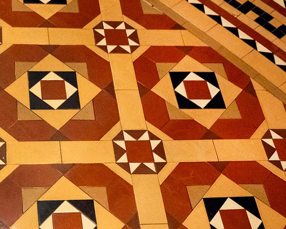 In the second-floor rotunda, visitors will observe a geometric mosaic floor of earth-toned shapes. These patterns create a “marquetry” effect similar to the inlaid woodwork of Renaissance Revival style furniture. The original tiles were manufactured by Maw and Company in Shropshire, England by hand using colored clay. The Capitol and Judge Edwin Crocker’s art gallery (now the Crocker Art Museum) in Sacramento were the only two buildings in the west to utilize these tiles. Despite a reputation for durability, the majority of these tiles had to be replaced with reproductions during the restoration – though the patterns remain faithful to the original design.