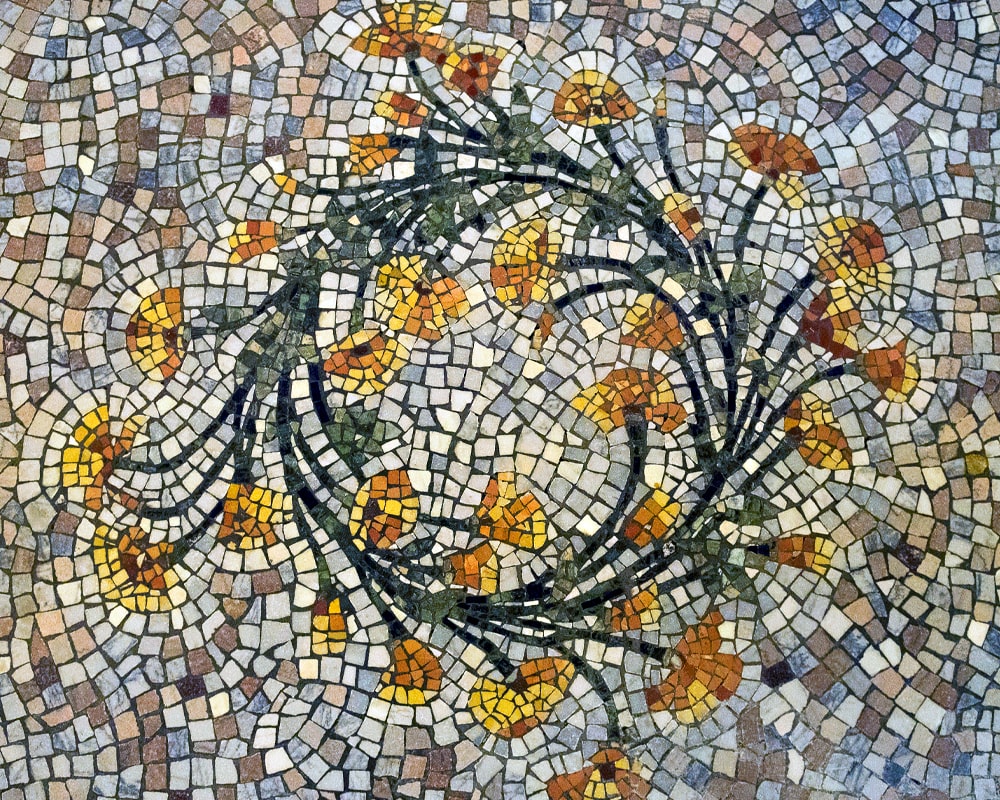Although construction began on the California State Capitol in the 1860s, Italian mosaicists installed marble tiles on the second floor in the north and south wings during the building’s first remodel in 1906. These floors consist of gray and peach marble with black, yellow, and red marble borders. Each section features golden poppy designs. The marble pieces used range from a quarter-of-an-inch to two inches in size. During the restoration in the 1970s, mosaicists completely disassembled the floor and cleaned each marble piece individually. They were then reinstalled using the exact processes that artisans had used 70 years prior.