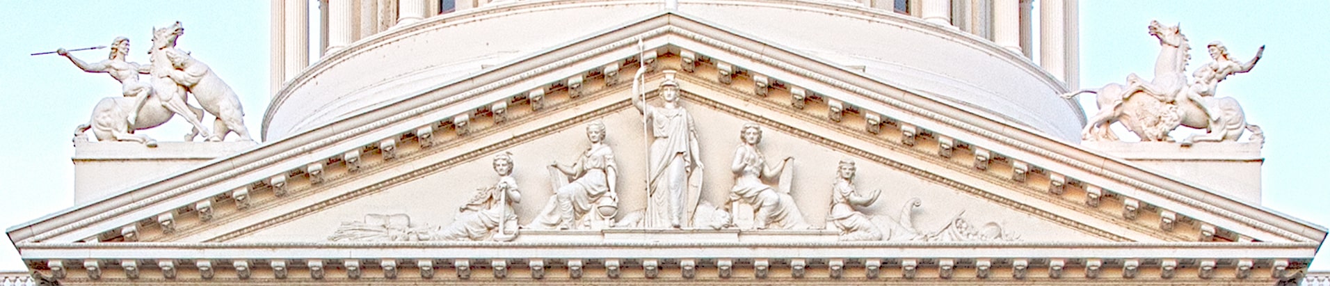 The pediment is a triangular gable situated beneath sloping rooflines. On the pediment is the tympanum. This elongated triangular space often contains sculptural reliefs. Decorative framing cornices and acroteria, or free-standing sculptures, can be seen along the roof lines. When the original California Capitol was constructed, the rooftop and pediment statuaries were created by sculptor Pietro Mezzara. Thirty figures, urns, and emblems adorned the Capitol in 1873. These elements were removed during the Capitol’s 1906 renovation and subsequently lost. Today, only the statuary on the west front pediment tympanum is original. Mezzara’s design features an 11-foot-high Minerva, Roman goddess of wisdom, with a bear at her feet. The figures to her left symbolize Justice and Mining; those to her right personify Education and Industry.