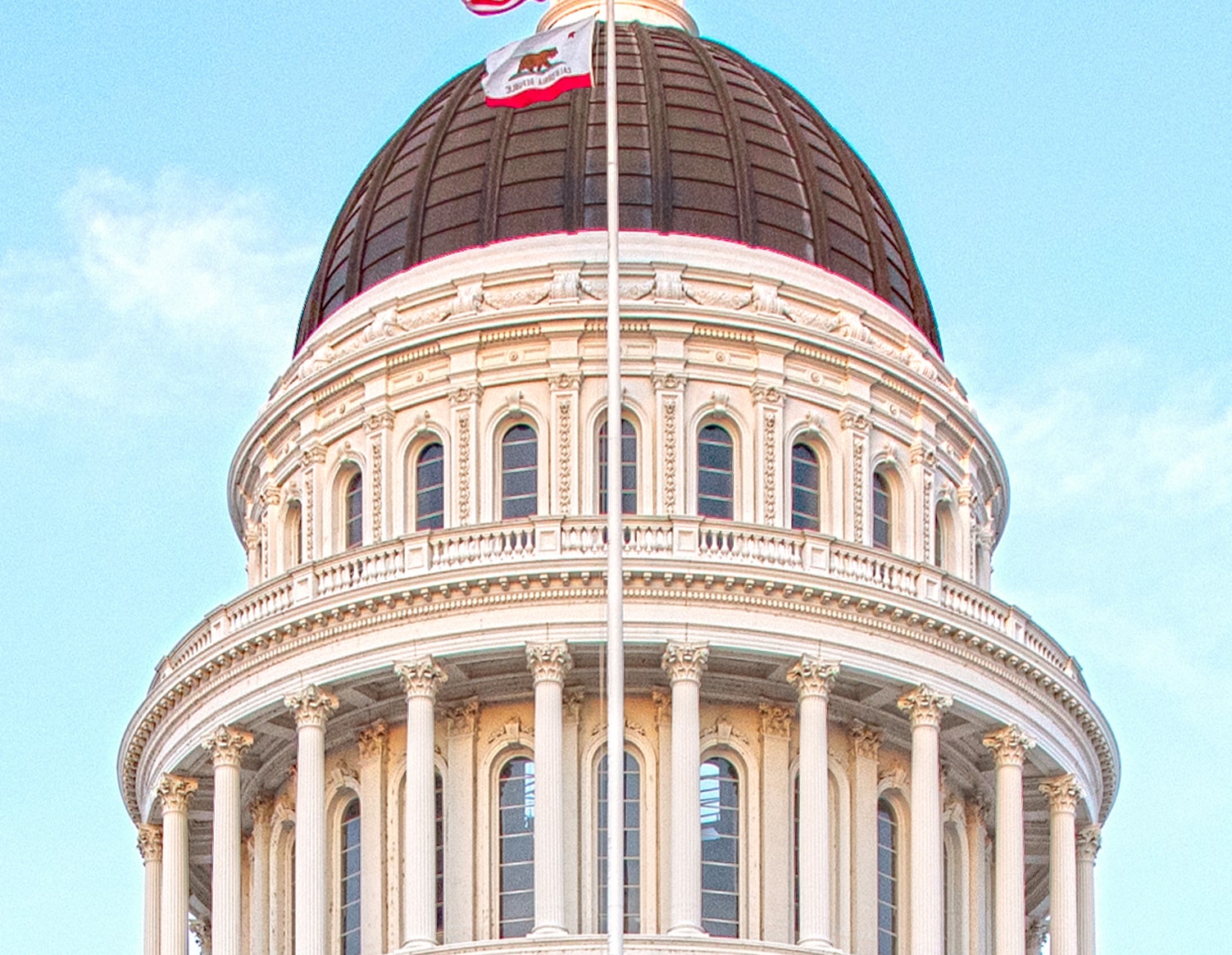 Neo-Classical design can frequently be seen in public architecture, particularly capitol buildings, throughout the United States. The California State Capitol was partially modeled after the United States Capitol. The latter features a bronze statue of a female figure in a helmet, called the Statue of Freedom, as the ornament atop the building’s dome. Given the already marked resemblance between the two capitols, the absence of a statue on the California State Capitol was intended to help distinguish between the two buildings. The California Capitol’s dome is crowned instead with a golden ball, reminiscent of a gold nugget, to remind visitors of the state’s Gold Rush heritage.