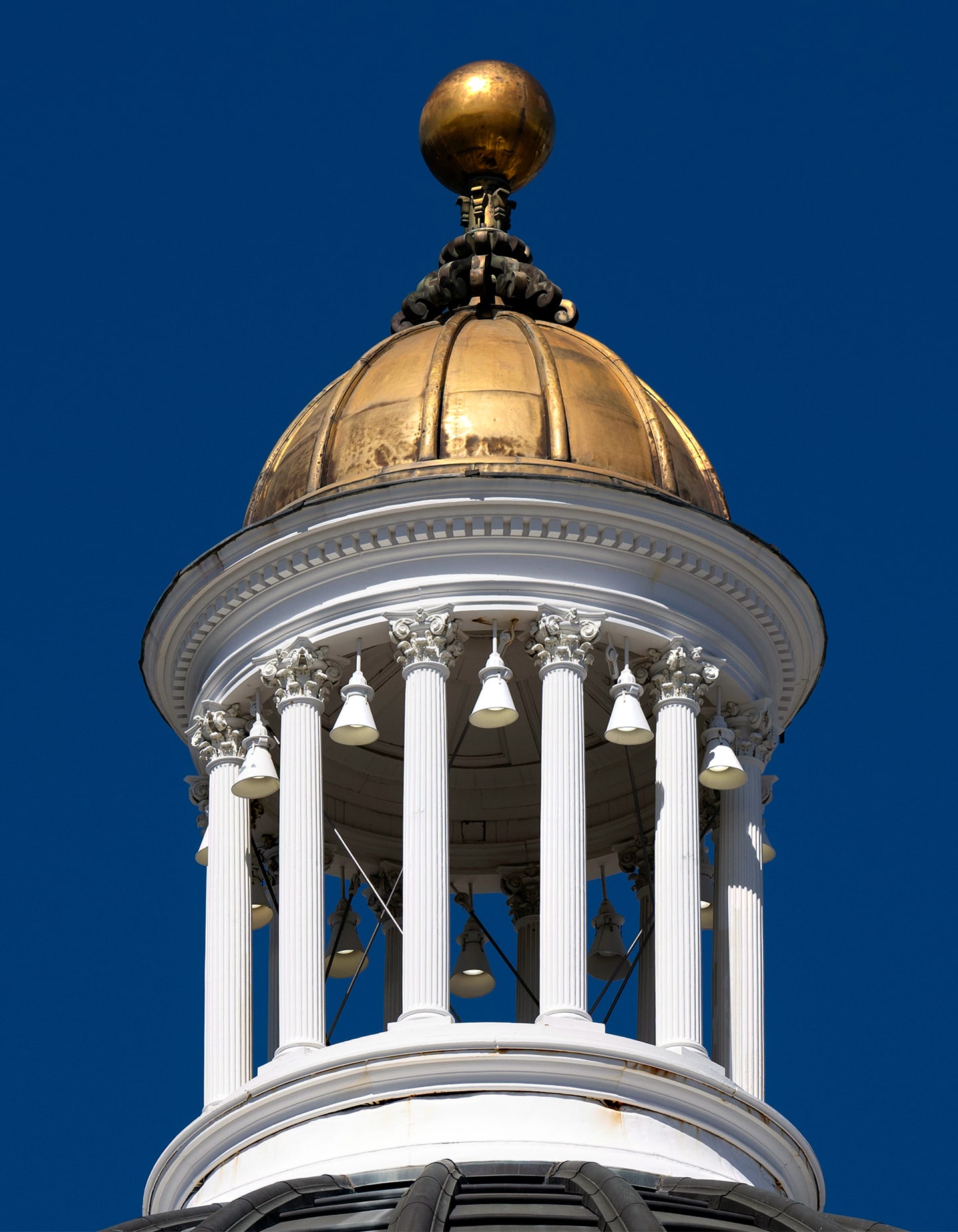 Detail of the California State Capitol building’s cupola and golden ball.