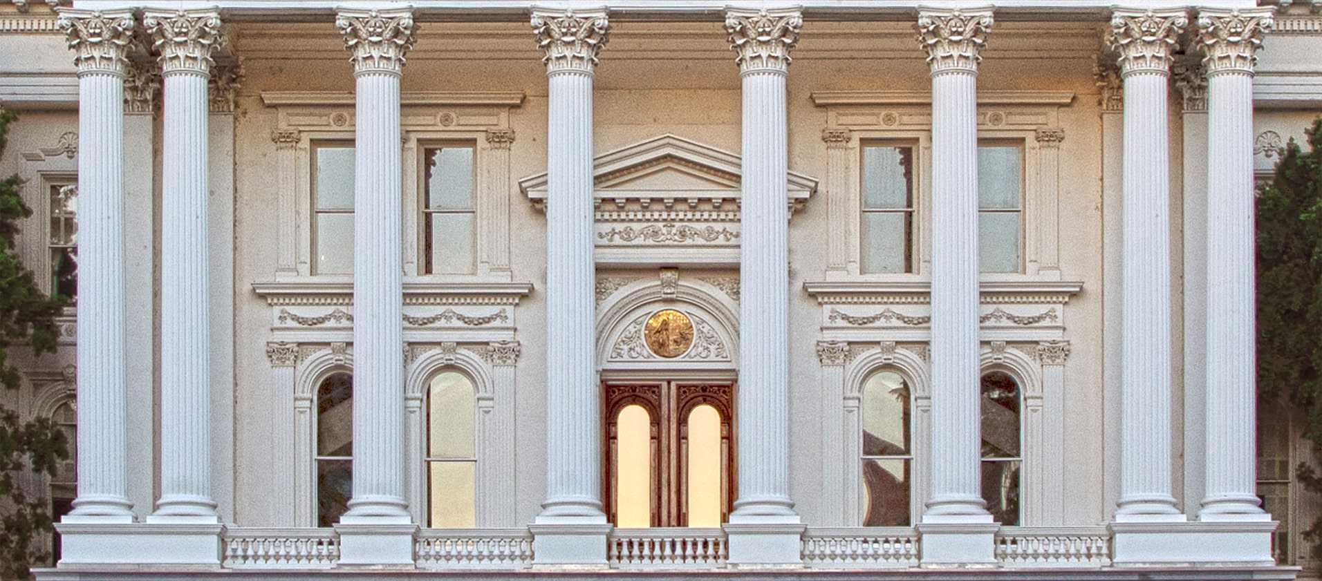 Large vertical columns support the pediment and its entablature. The California State Capitol’s portico features eight Corinthian columns. Drawn from the architectural traditions of ancient Greece, Corinthian columns can be recognized by the ornate leafy carvings on their uppermost section (also called a “capital”).