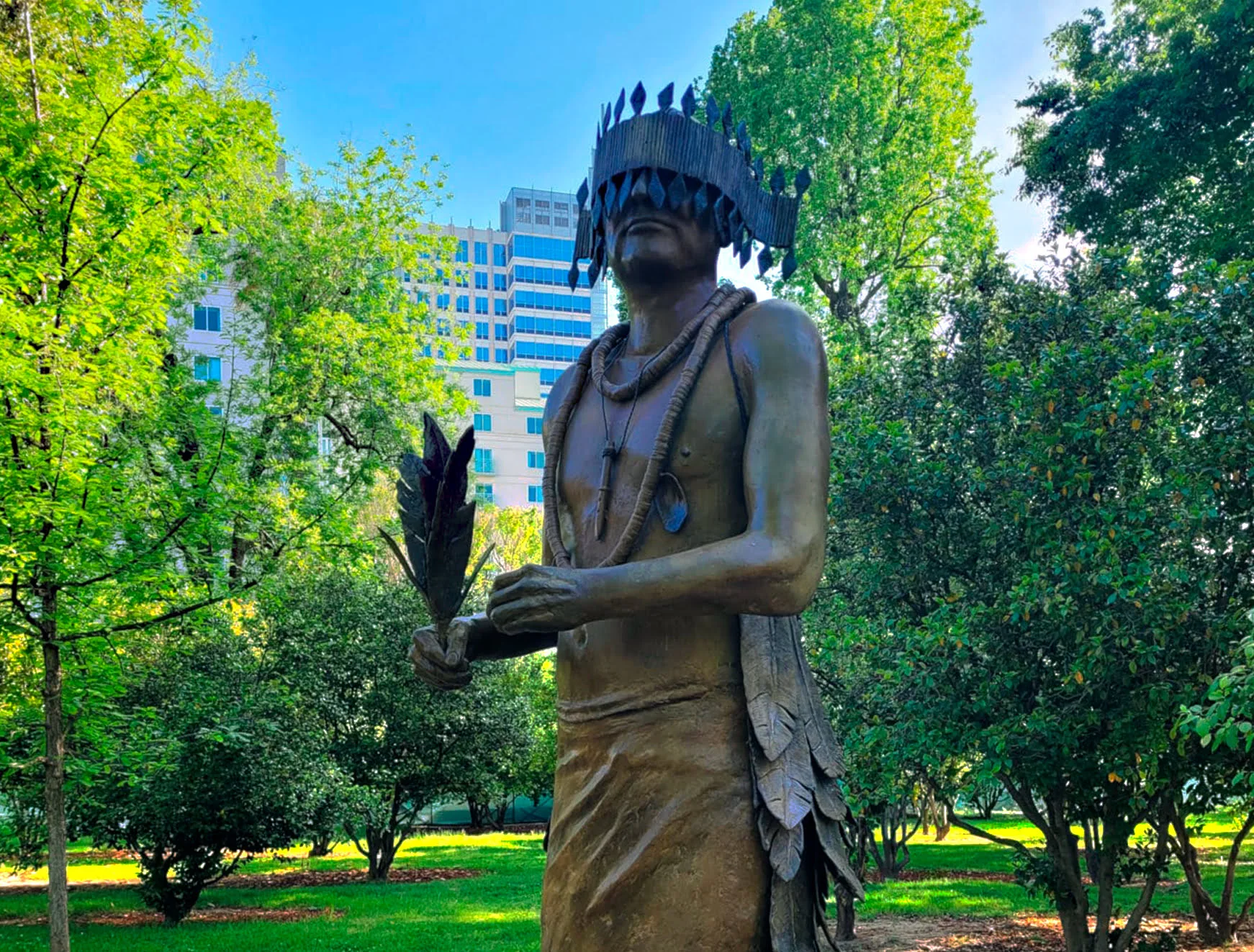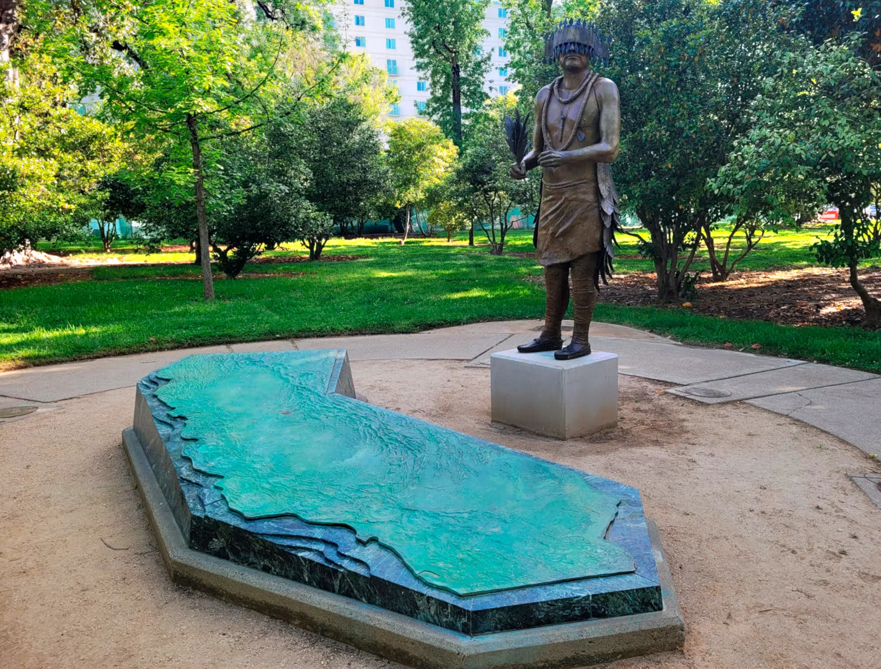 The California Native American Monument was unveiled on November 7th, 2023, during Native American Heritage Month. Located in Capitol Park near 13th and L Streets, the bronze statue is eight feet tall and depicts Miwok community leader William Franklin, Sr. in traditional dance regalia. Franklin’s likeness was chosen to represent the Miwok and Nisenan tribes whose ancestral lands make up present-day Sacramento. Nine seals depicting California native plants and animals encircle the monument, emblematic of the deep connection between the natural world and the Nisenan and Miwok peoples.