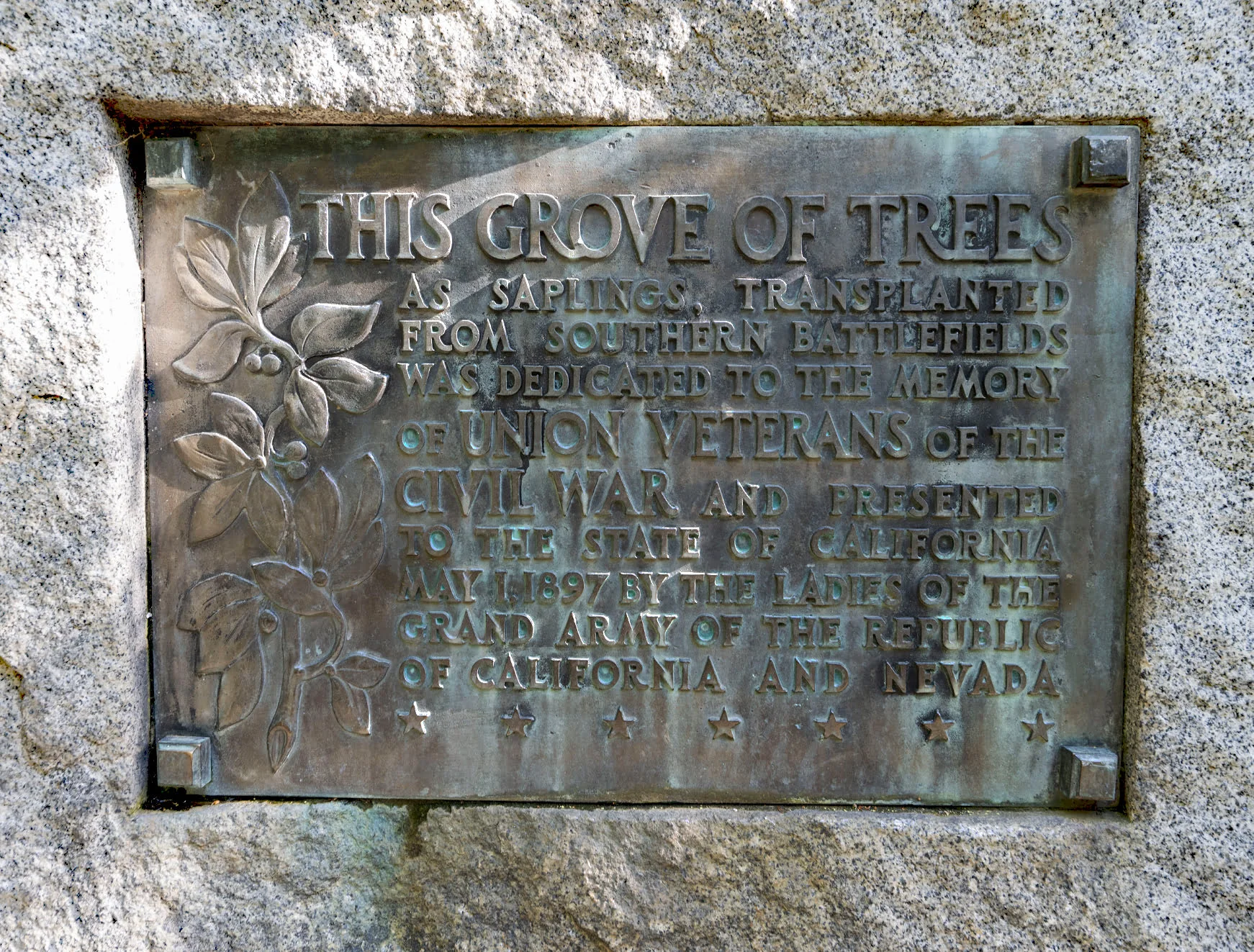 The idea for the Memorial Grove dates to 1896, 31 years after the Confederate Army’s surrender marked the end of the American Civil War. Mrs. Eliza Waggoner and the Ladies of the Grand Army of the Republic, an organization of veterans’ wives and daughters, led the effort to create the memorial. Although California had sided with the Union Army, they felt the grove should represent all those who fought in the four-year war. Their concept was a living memorial featuring trees from important battlefields and other sites connected to the war.