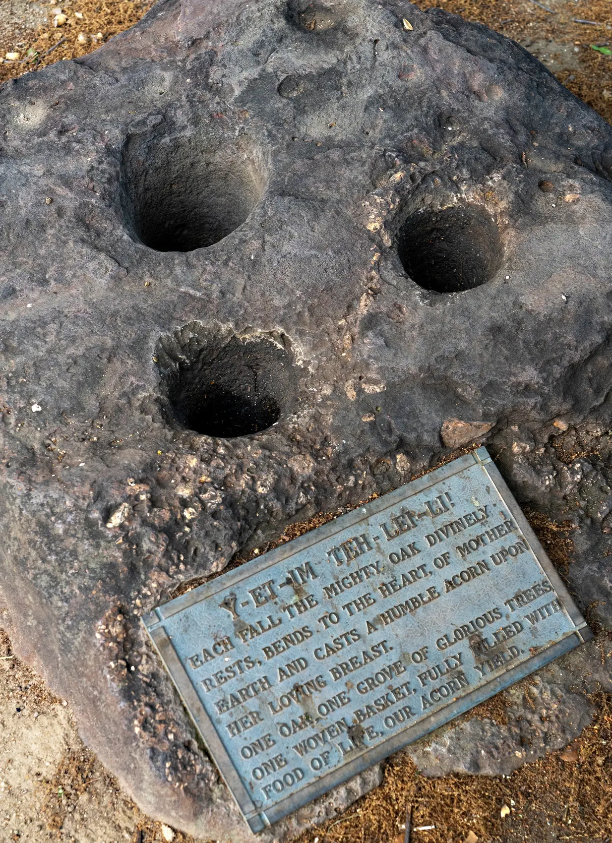 Some prefer to call such rocks “pounding rocks,” since acorns were pounded into meal rather than ground. Others call them “bedrock mortars,” because the rocks served as a mortar against which women pounded the dried acorns using a stone pestle. This process left holes in the rock over many generations of use.
