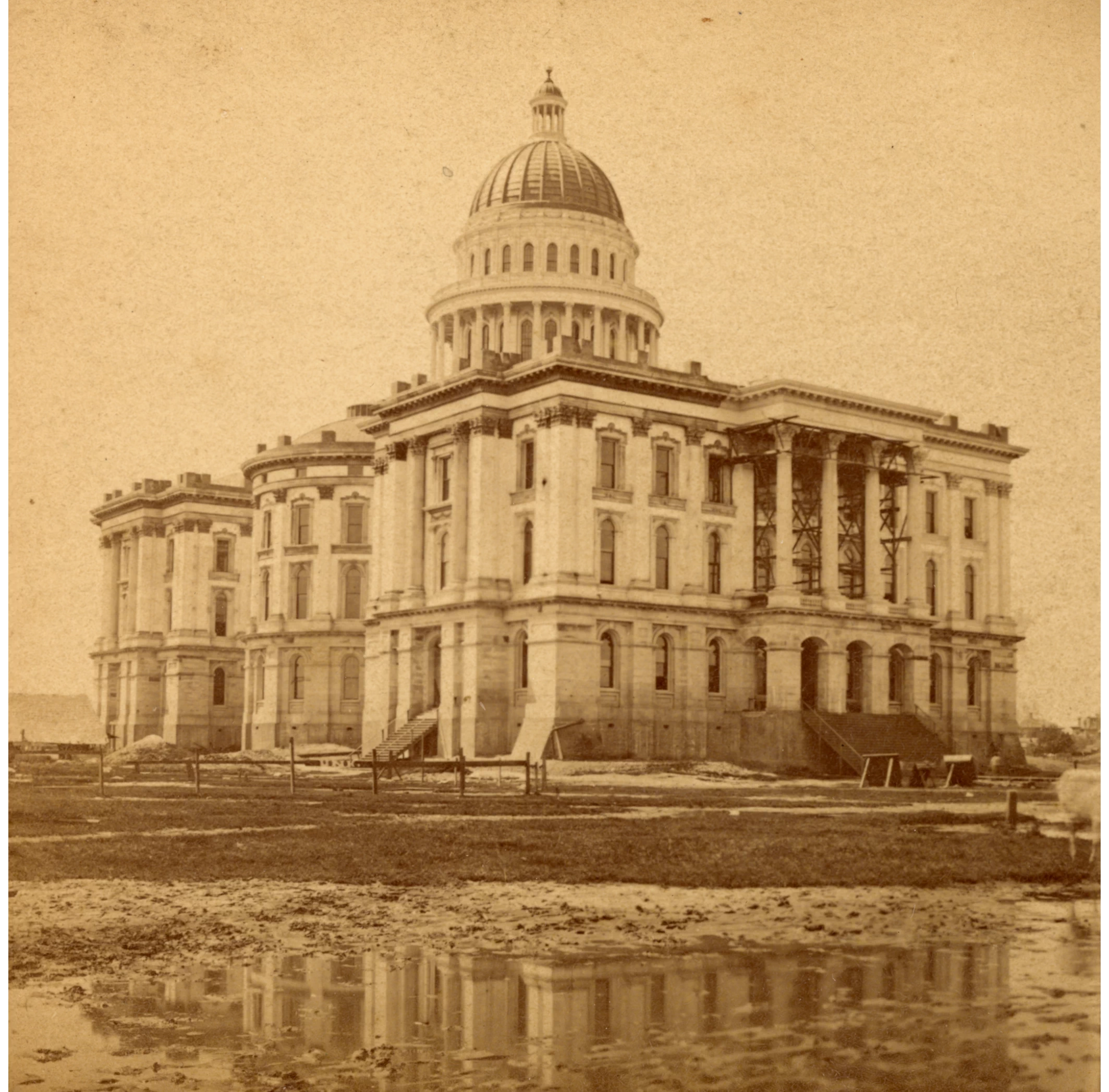 Groundbreaking for the Capitol building took place on December 4th, 1840. It took over a decade and several administrations to complete the construction effort due to funding issues, flooding, labor and supply problems, and political strife. Late in 1869, the Capitol was partially completed and able to accommodate the Legislature and several state officers, including the Governor. It would still take an additional five years to finish the building.