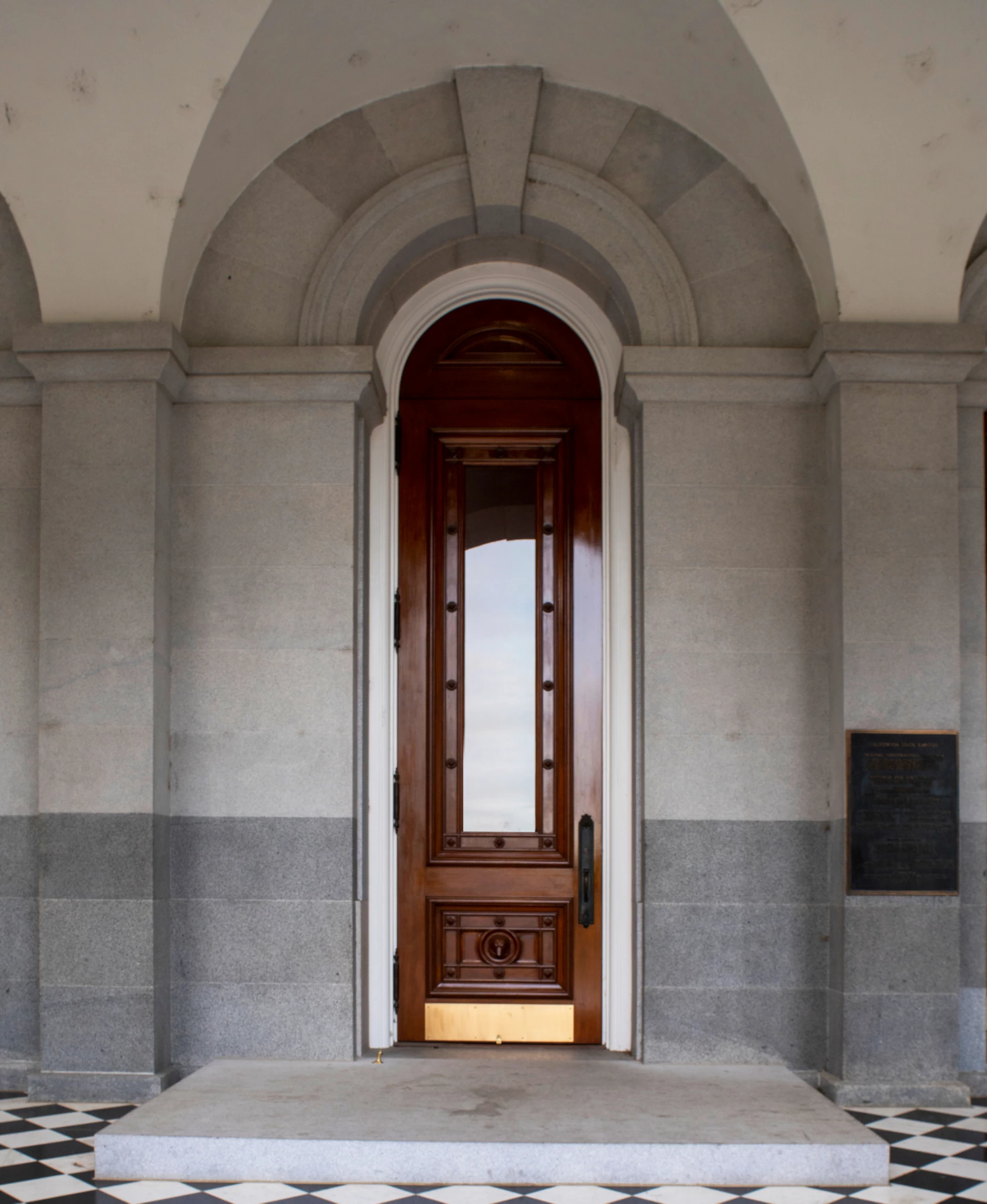 A close look at the western façade of the Capitol reveals two different types of granite: a dark gray granite from the Folsom area called “Ambassador Black,” and a lighter-colored Rocklin stone, “Sierra White.”
