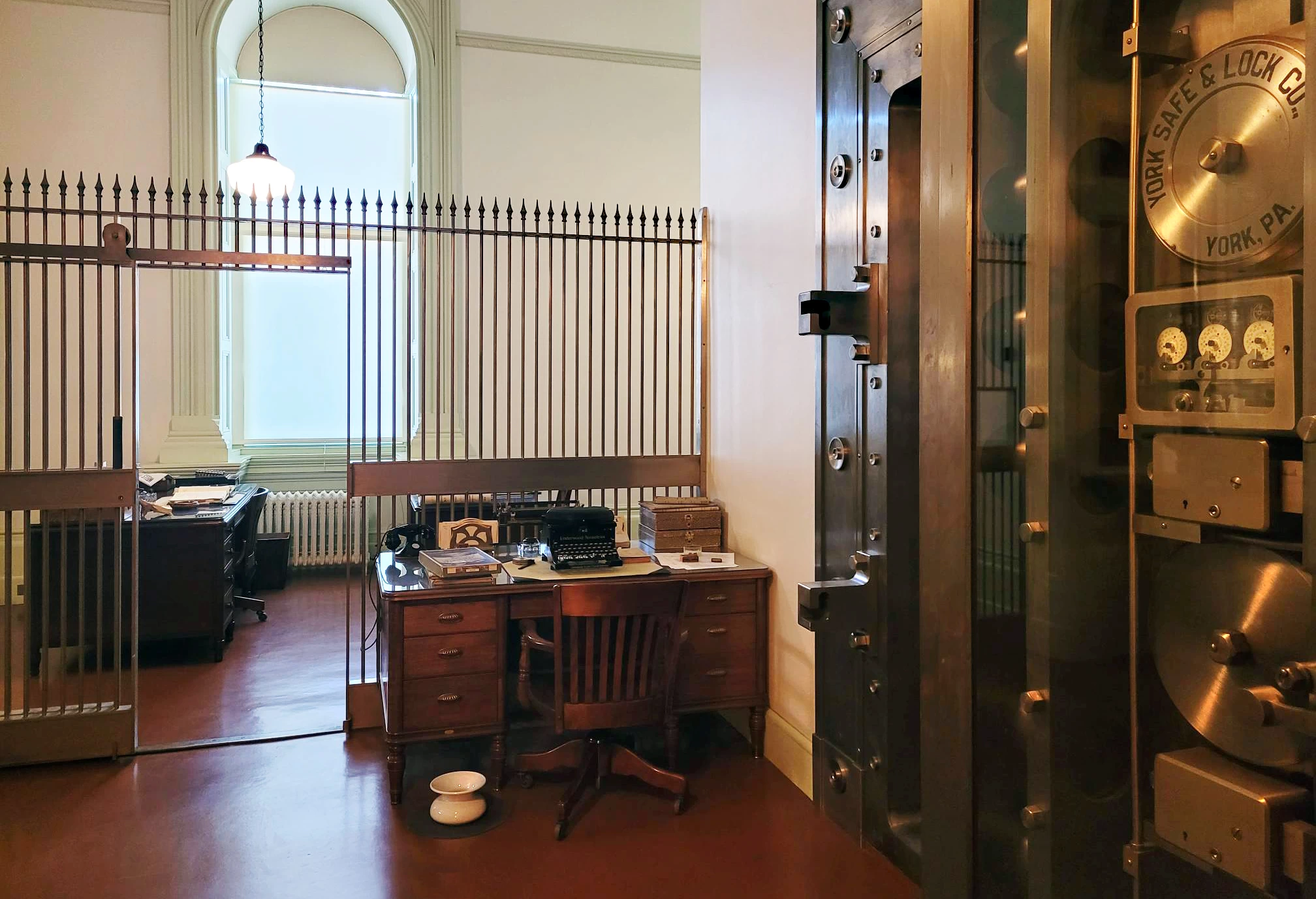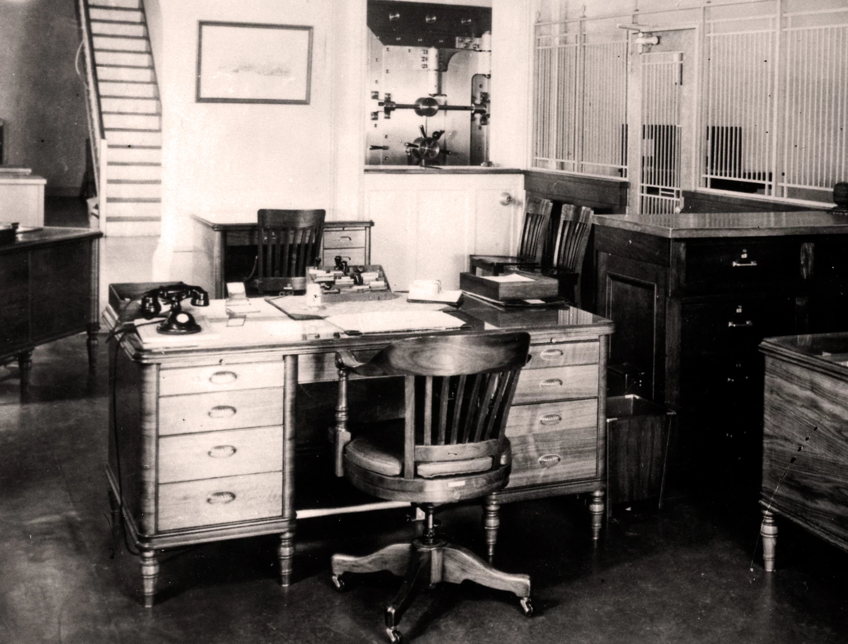 The 1933 Treasurer’s Office was divided into two sections separated by a seven-foot-high metal grill. A central door allowed passage between the two sections. One side housed the vault officers’ desks. These officers were responsible for delivering and receiving authorized bonds and maintaining the security of the vault and its contents. On the other side, a deposit officer kept track of the daily sales and receipts of bonds and securities. They also prepared a monthly report for the State Controller that listed the state’s investments and the contents of the vault. Charles G. Johnson, whose office has been recreated here, served as the State Treasurer from 1922 to 1956. He was the only State Treasurer born outside of the United States to occupy the position. Ivy Baker Priest, the first female State Treasurer, served from 1967 to 1975 and was the last Treasurer to occupy these rooms at the State Capitol.