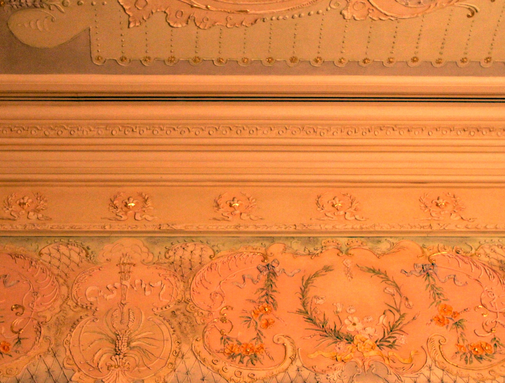 Restoration workers made molds of the original Lincrusta wall coverings and cast reproductions in fiberglass. This method could not be applied to the ceiling and frieze plasterwork, as the dimensions of the designs needed to be altered due to variations in room size.