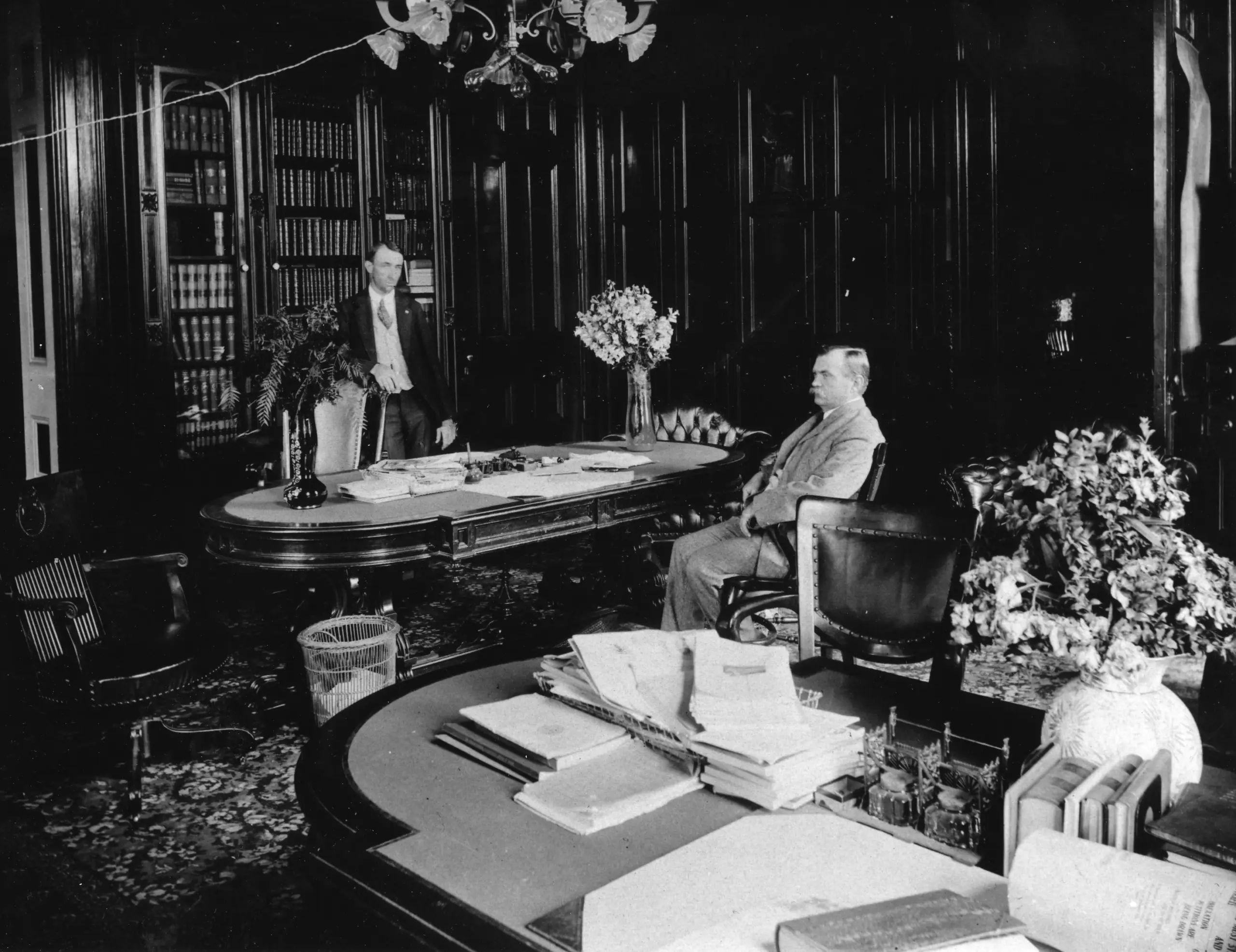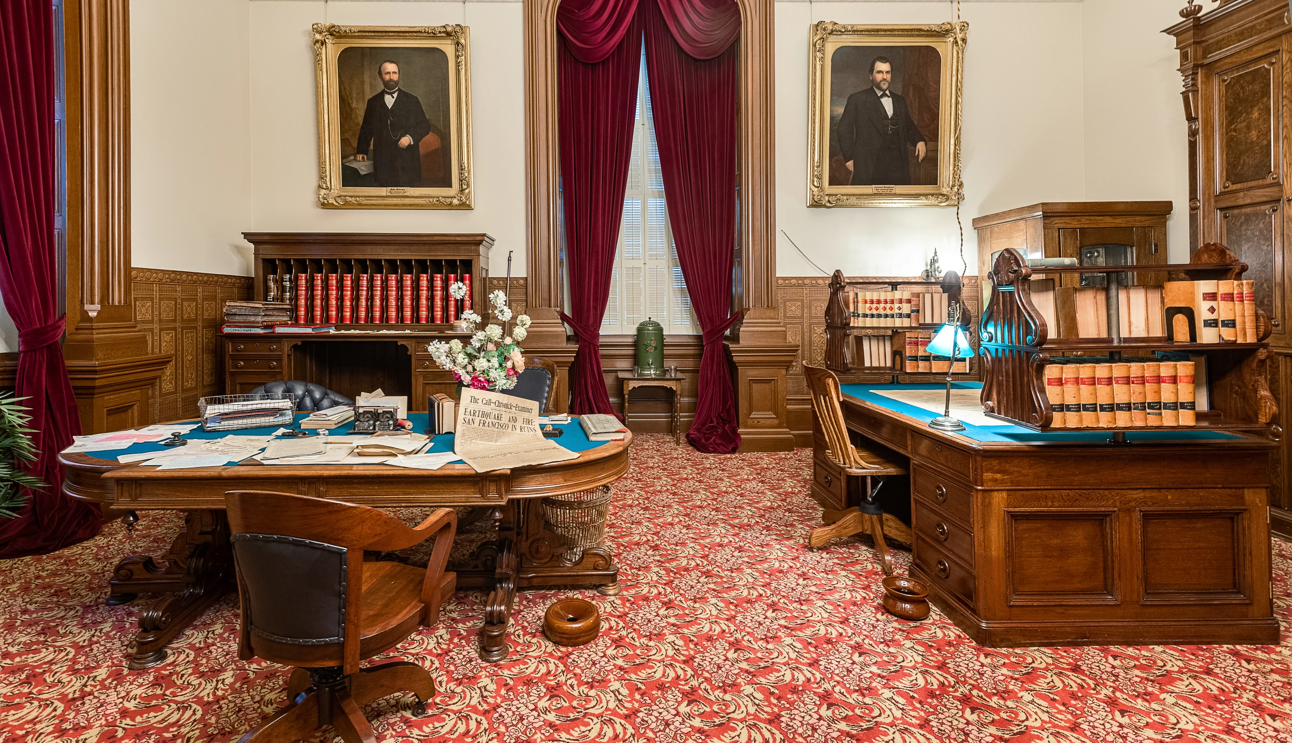 Key members of the governor’s staff operated out of this room from 1869 to 1951. The historic Main Office has been restored to appear as it did in April 1906 during the tenure of Governor George Pardee. In this space, Pardee’s Private Secretary and advisor, A.B. Nye, handled the day-to-day management of the governor’s office and reviewed incoming correspondence. J. Arthur Elston worked as Executive Secretary and Nye’s assistant from one of these walnut desks.